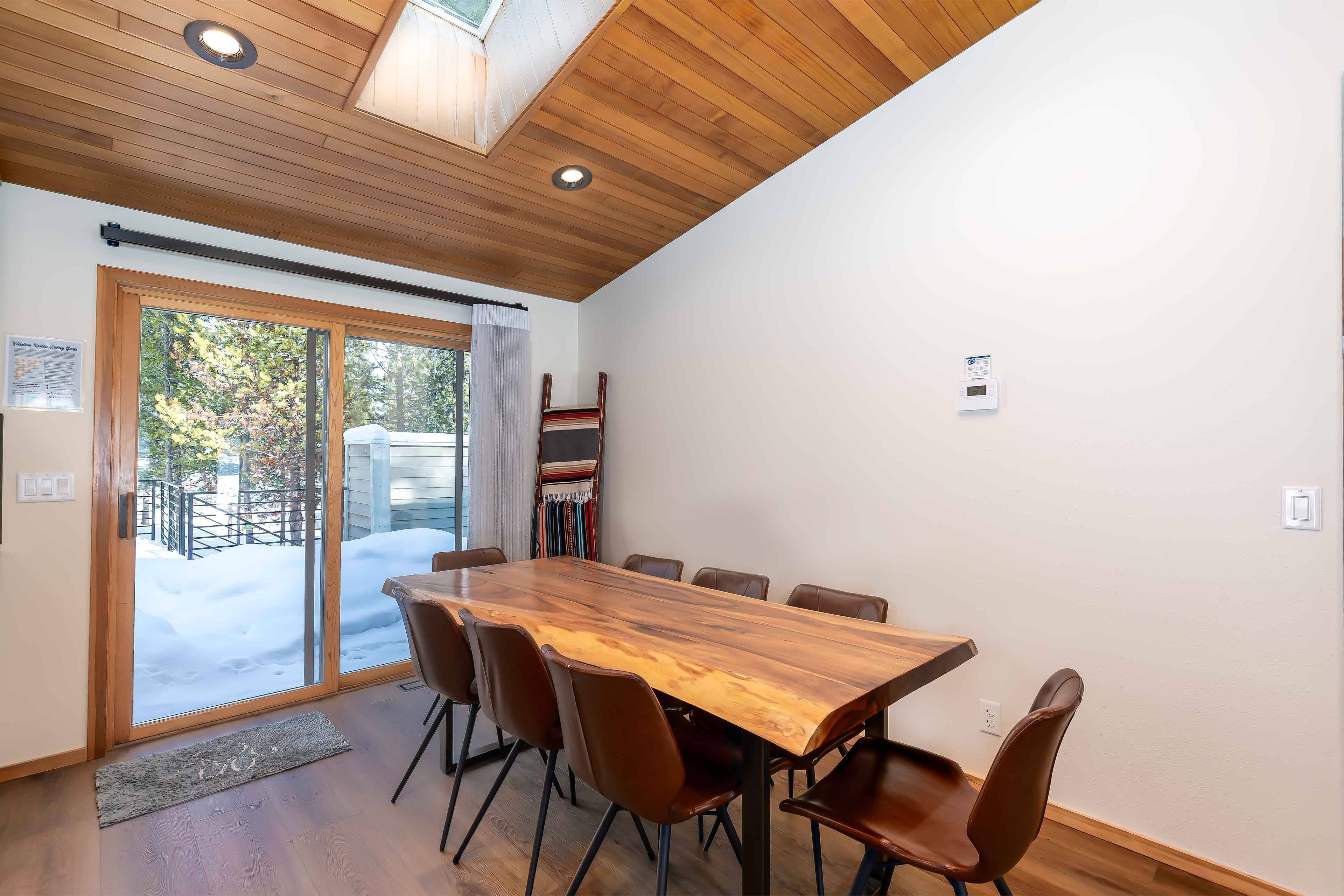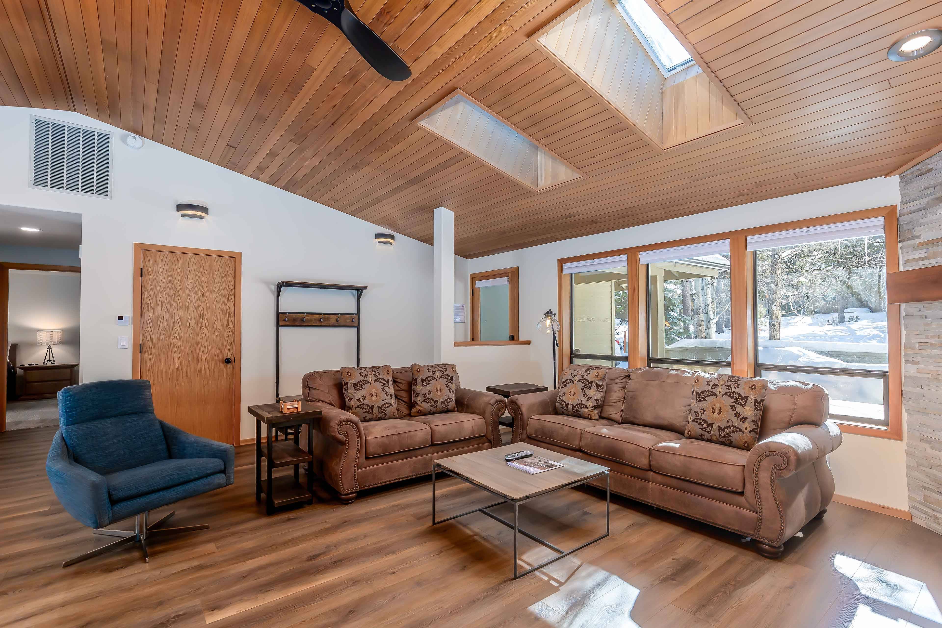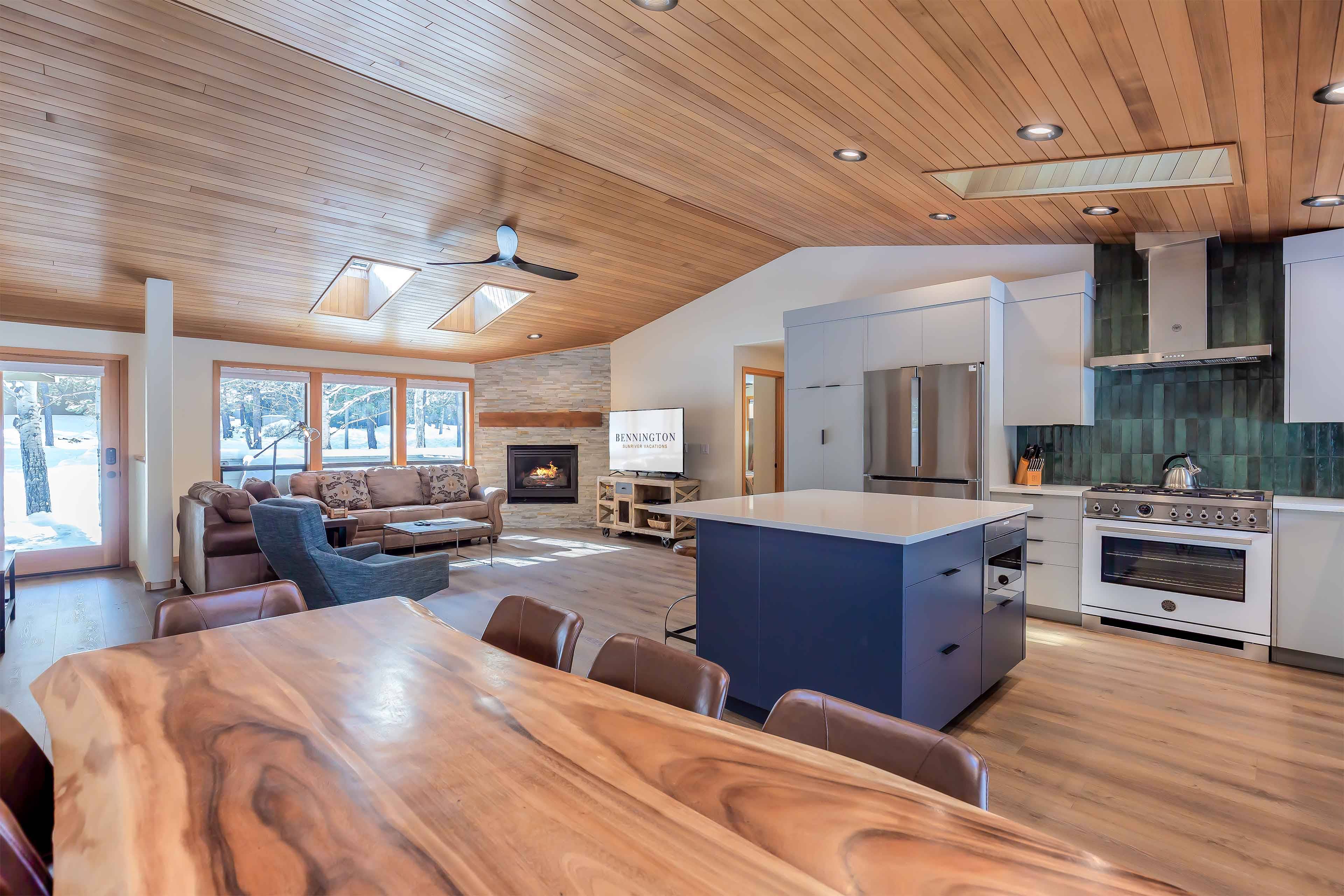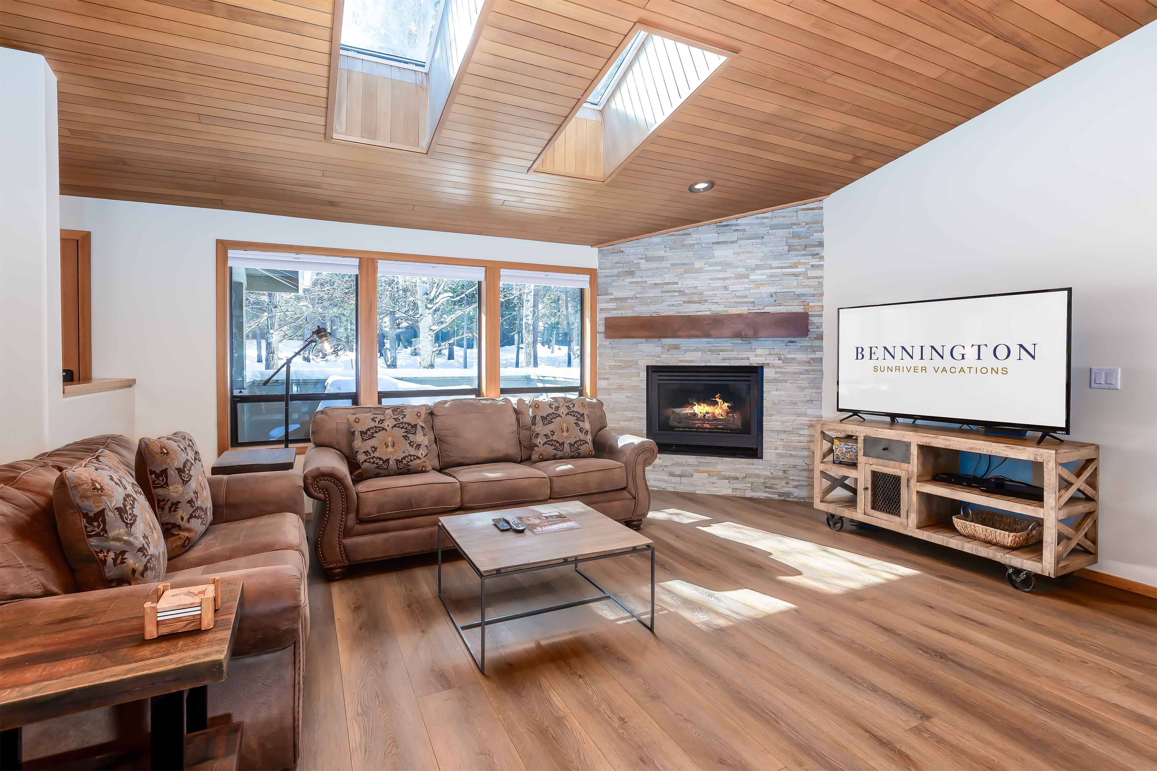 Escape to comfort and fun in this spacious, family-friendly Sunriver retreat! With vaulted ceilings, skylights, and a cozy gas fireplace, the living room is a bright and welcoming space to gather, play games, or unwind after a day of outdoor adventures. The fully stocked, modern kitchen makes mealtime a breeze, and the adjacent dining area is perfect for everything from pancake breakfasts to board game showdowns.