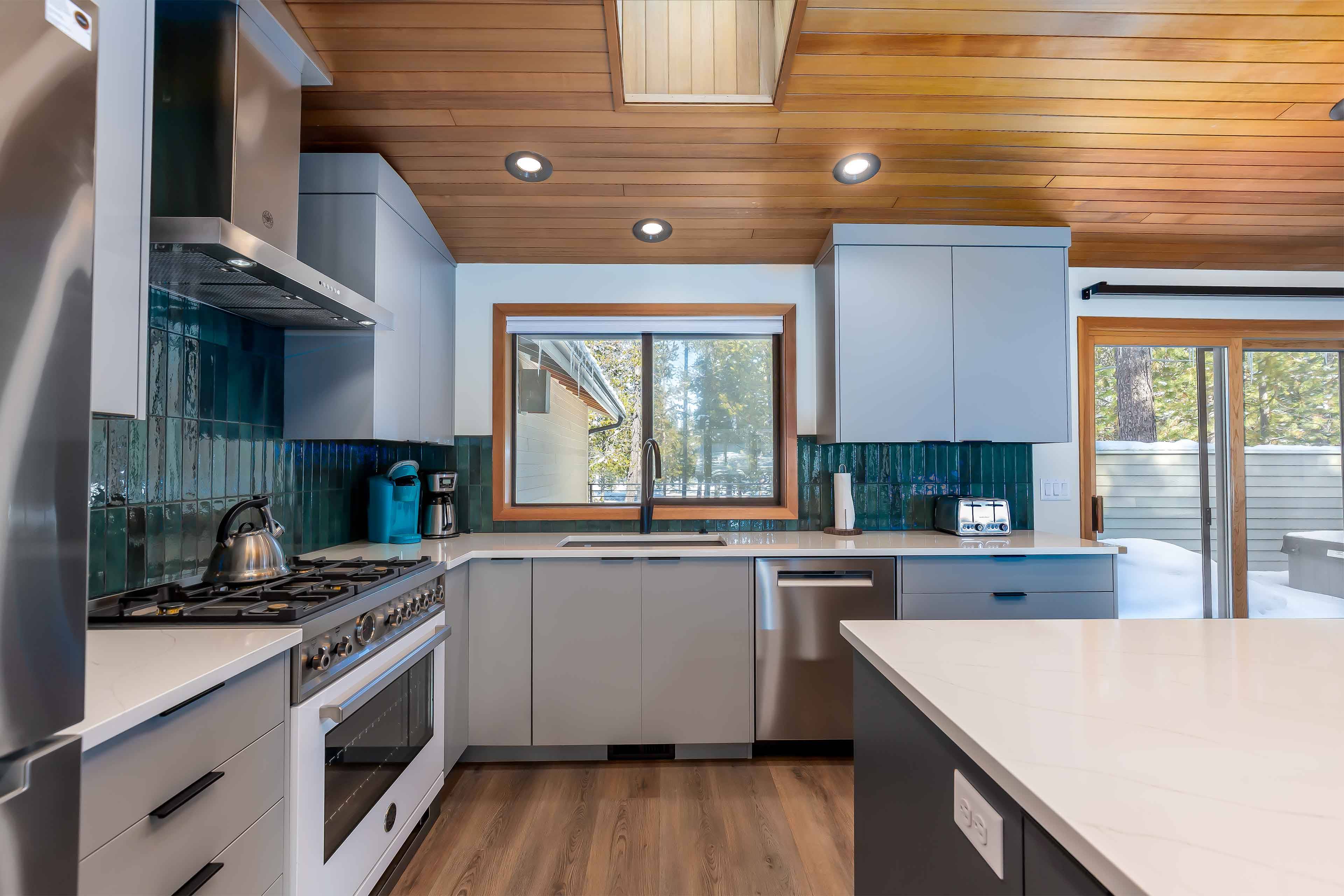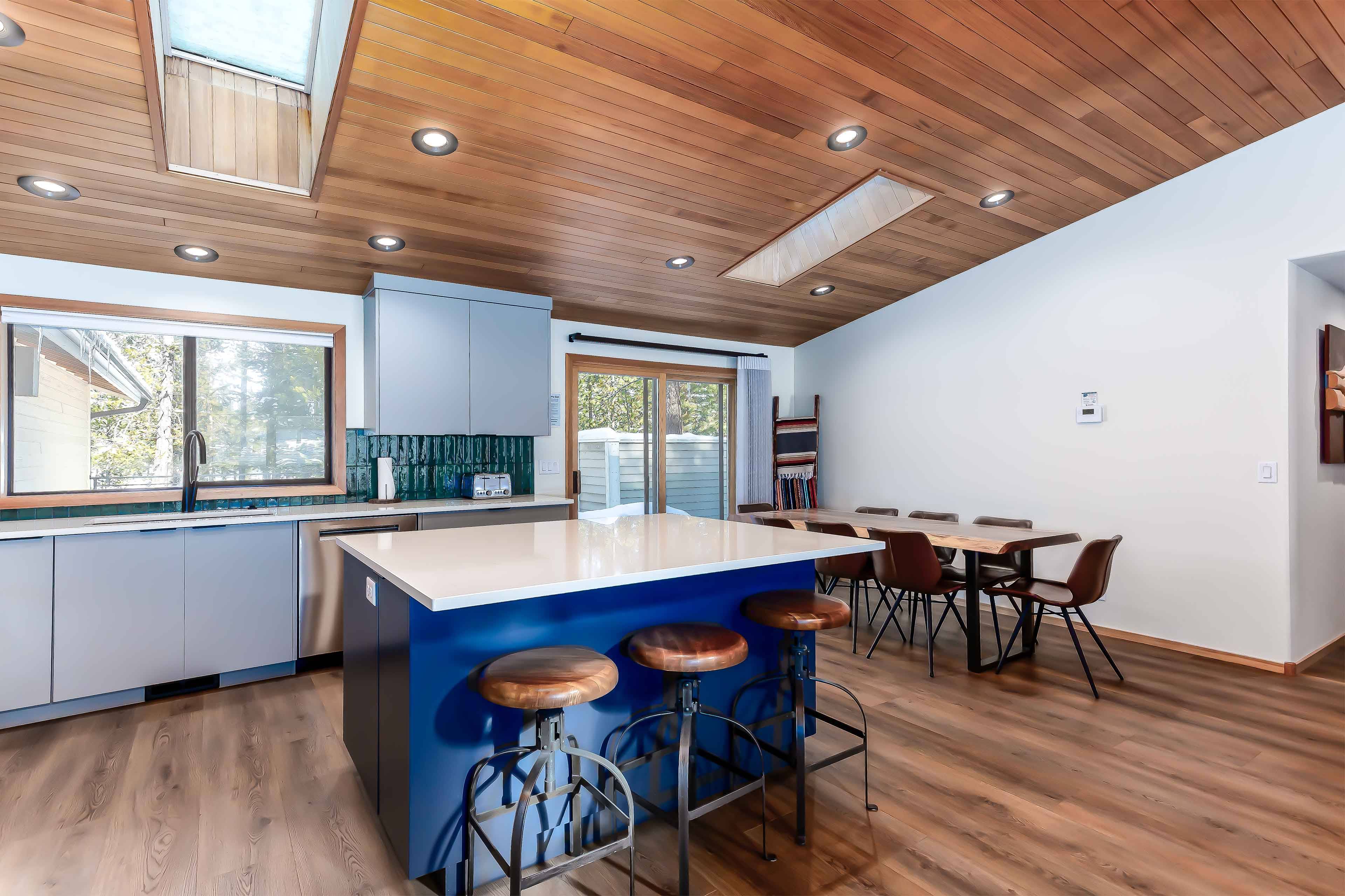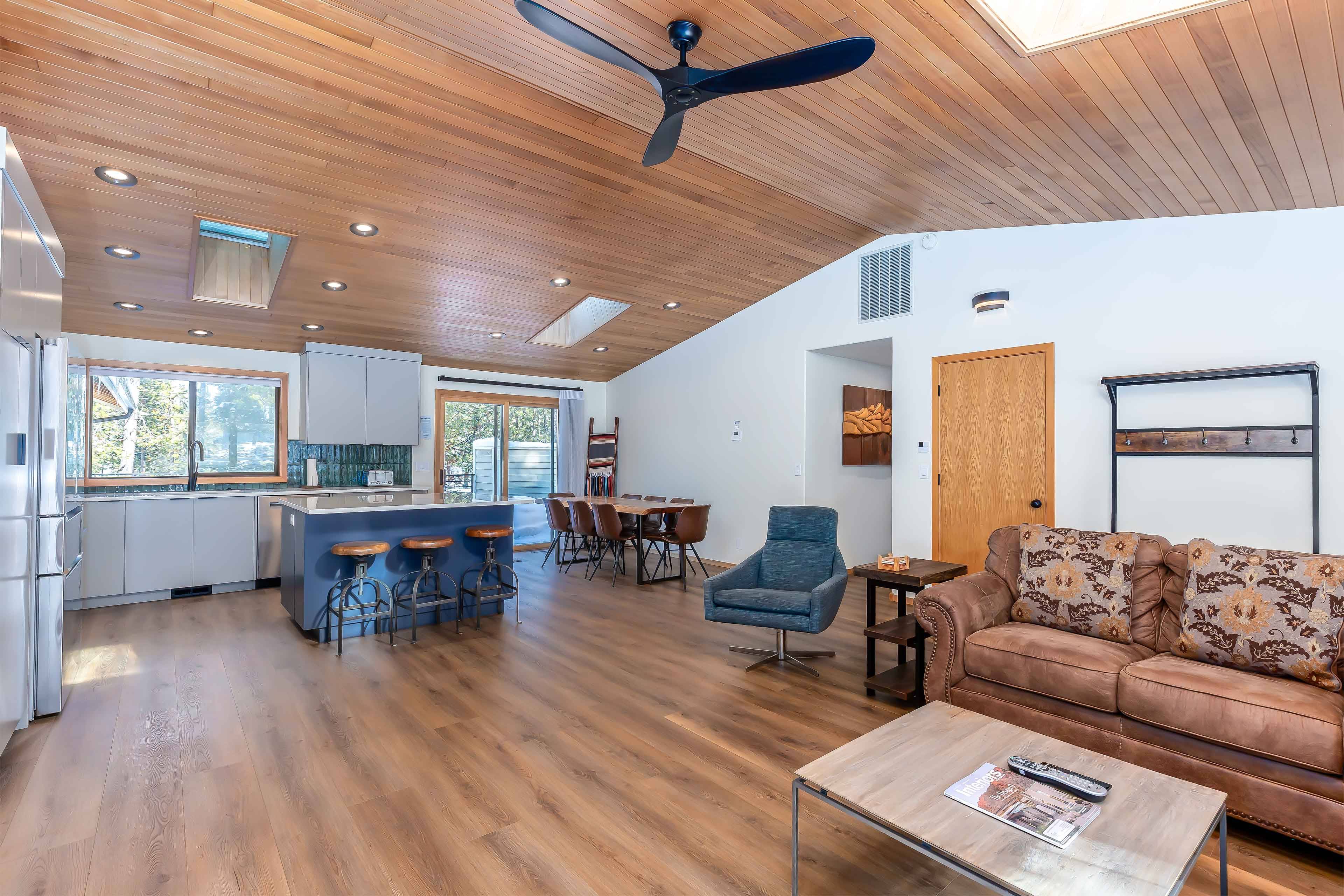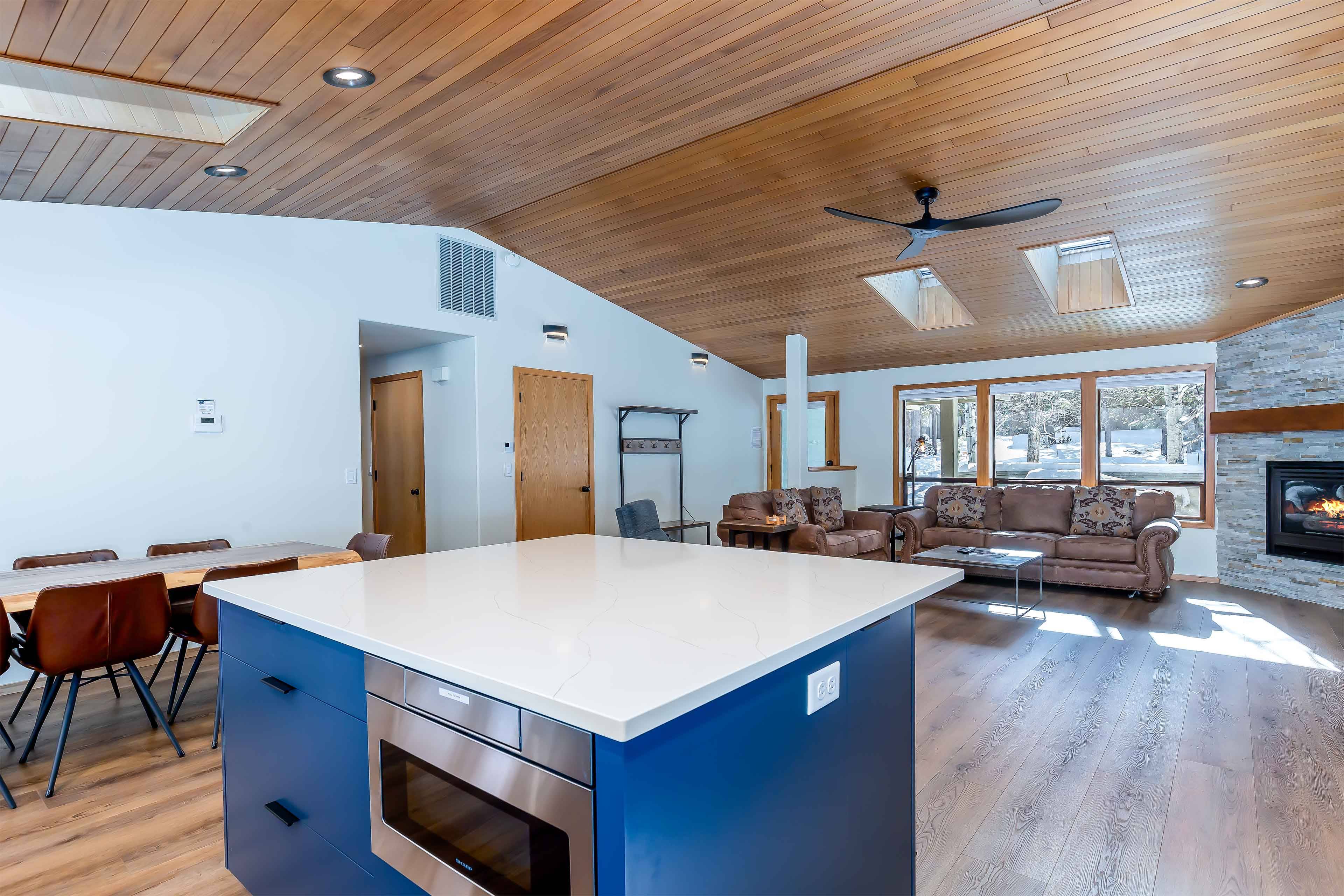Escape to comfort and fun in this spacious, family-friendly Sunriver retreat! With vaulted ceilings, skylights, and a cozy gas fireplace, the living room is a bright and welcoming space to gather, play games, or unwind after a day of outdoor adventures. The fully stocked, modern kitchen makes mealtime a breeze, and the adjacent dining area is perfect for everything from pancake breakfasts to board game showdowns.