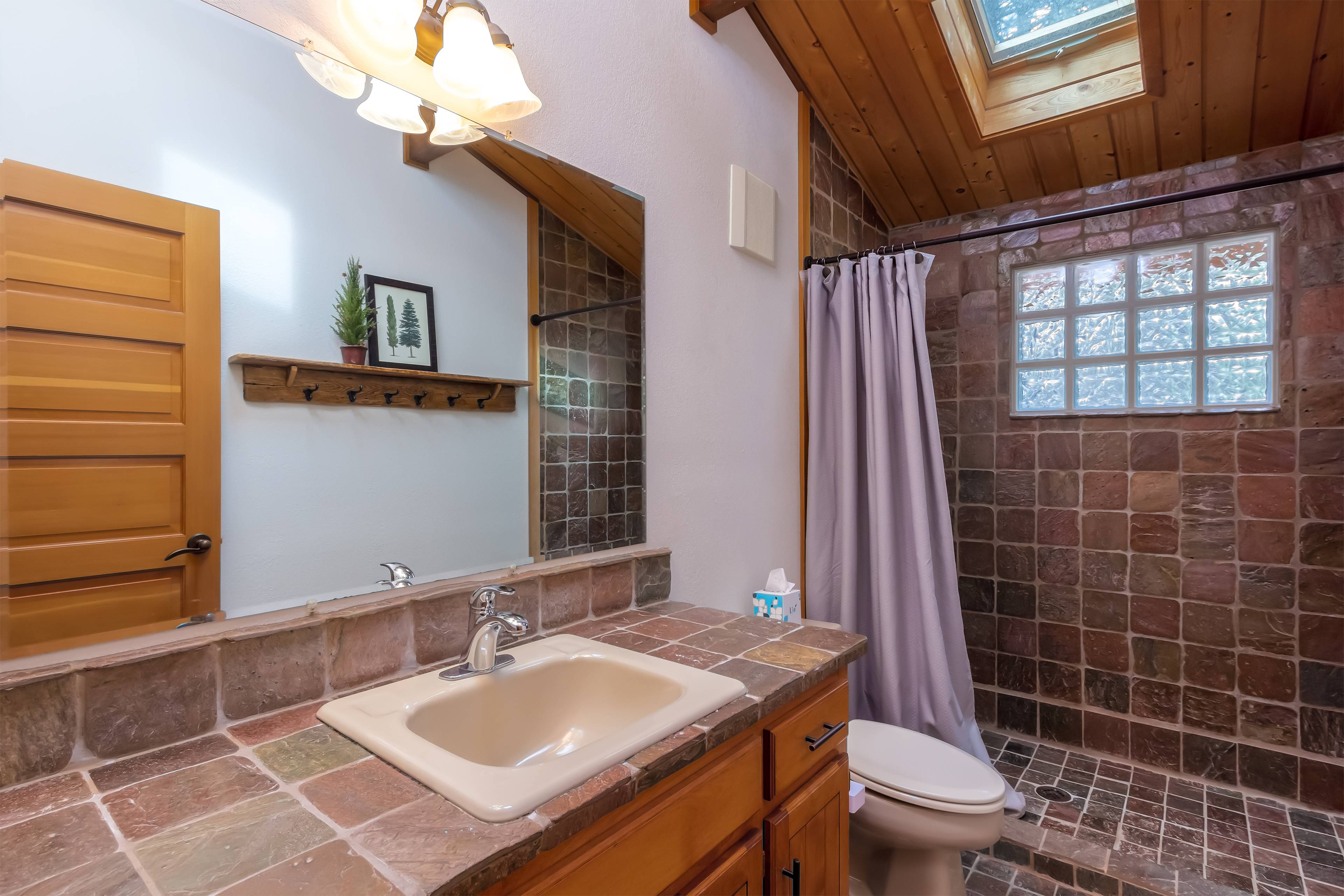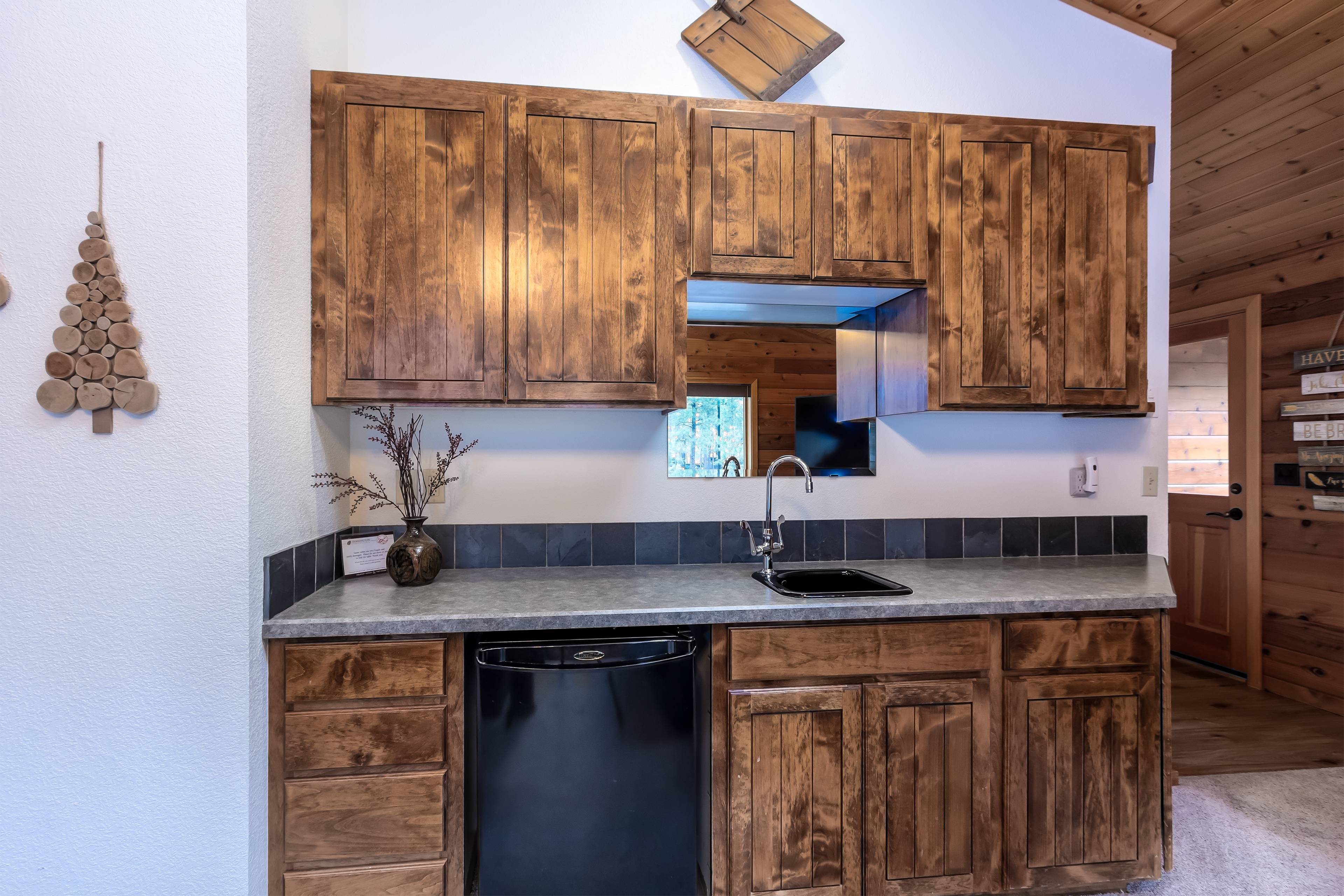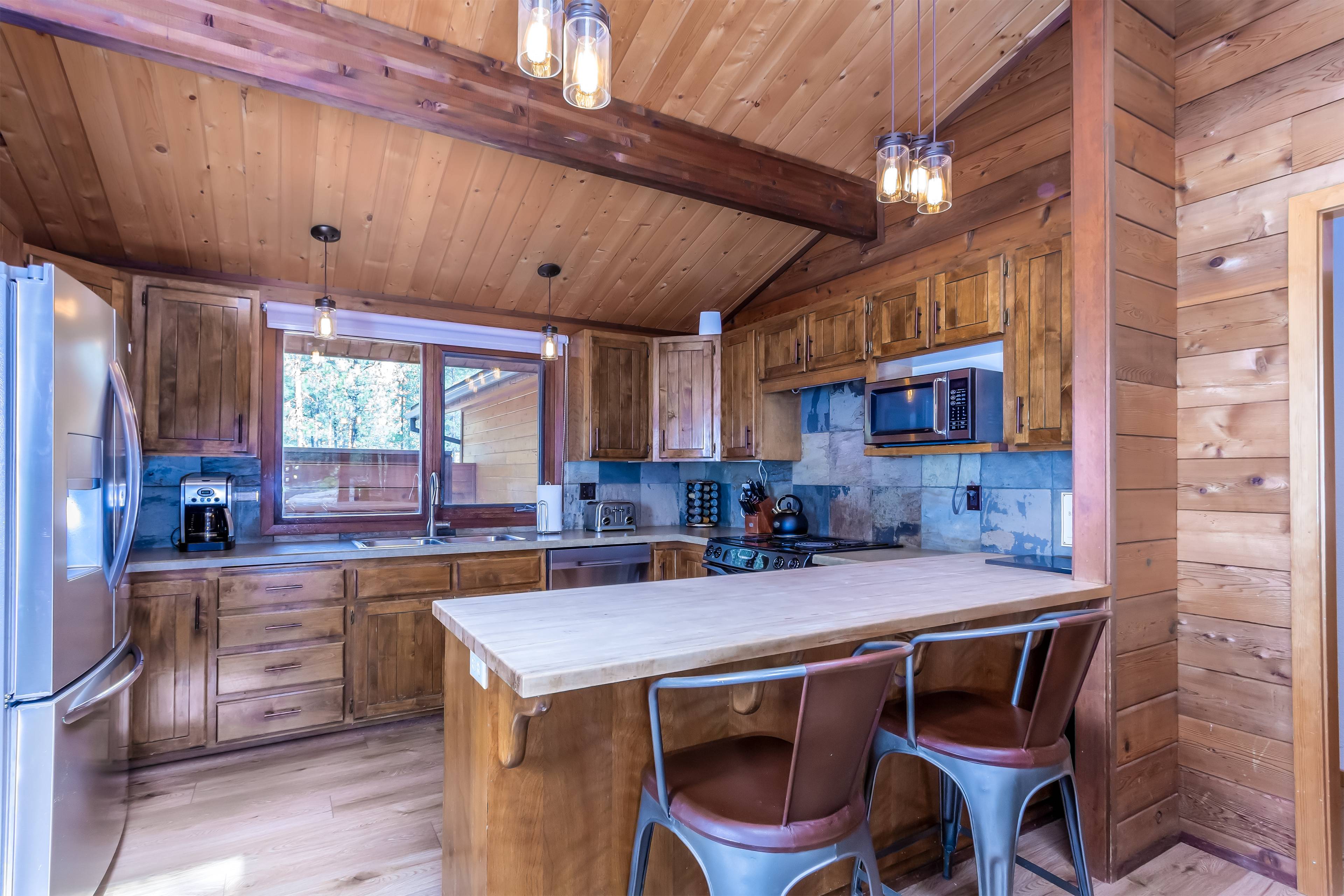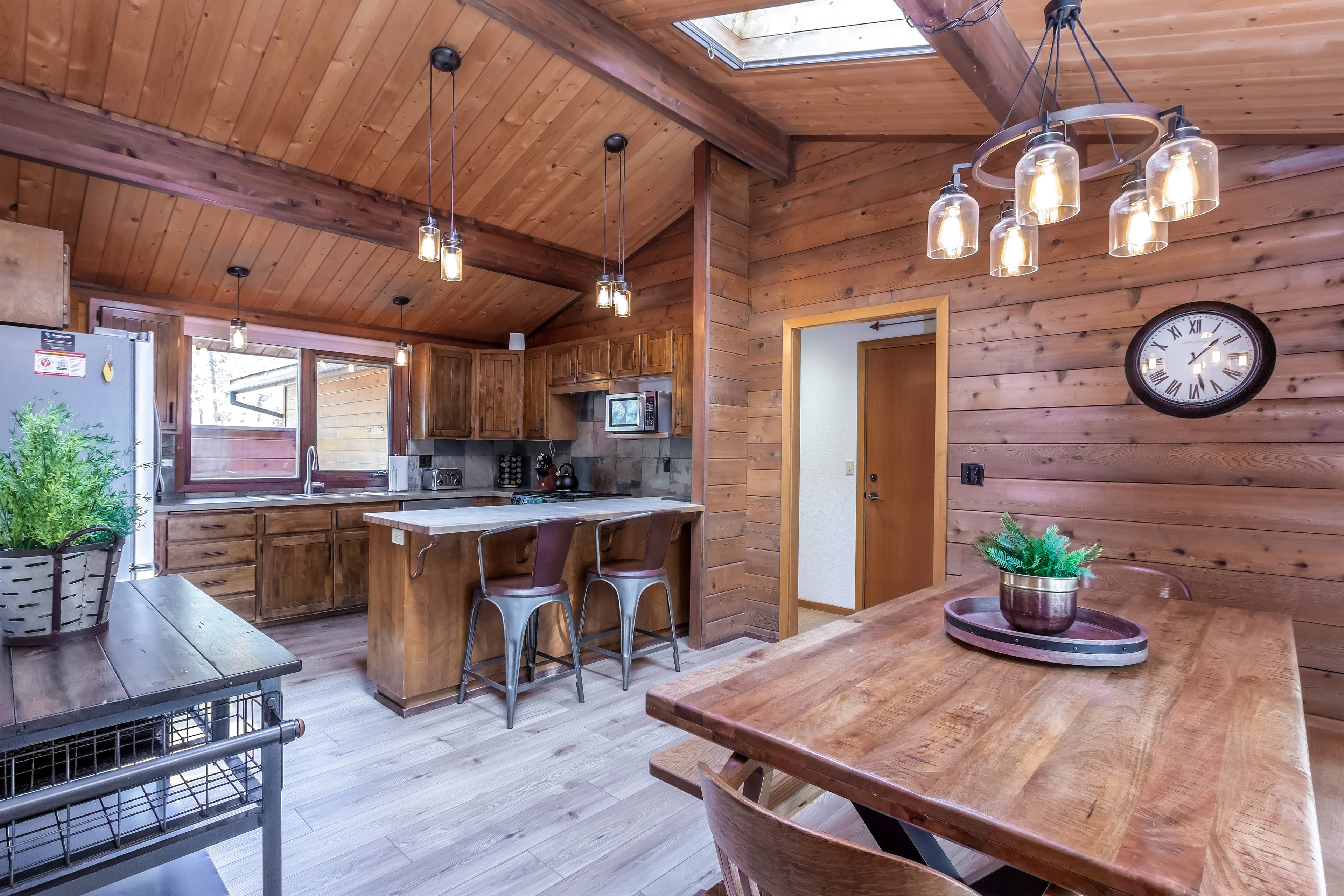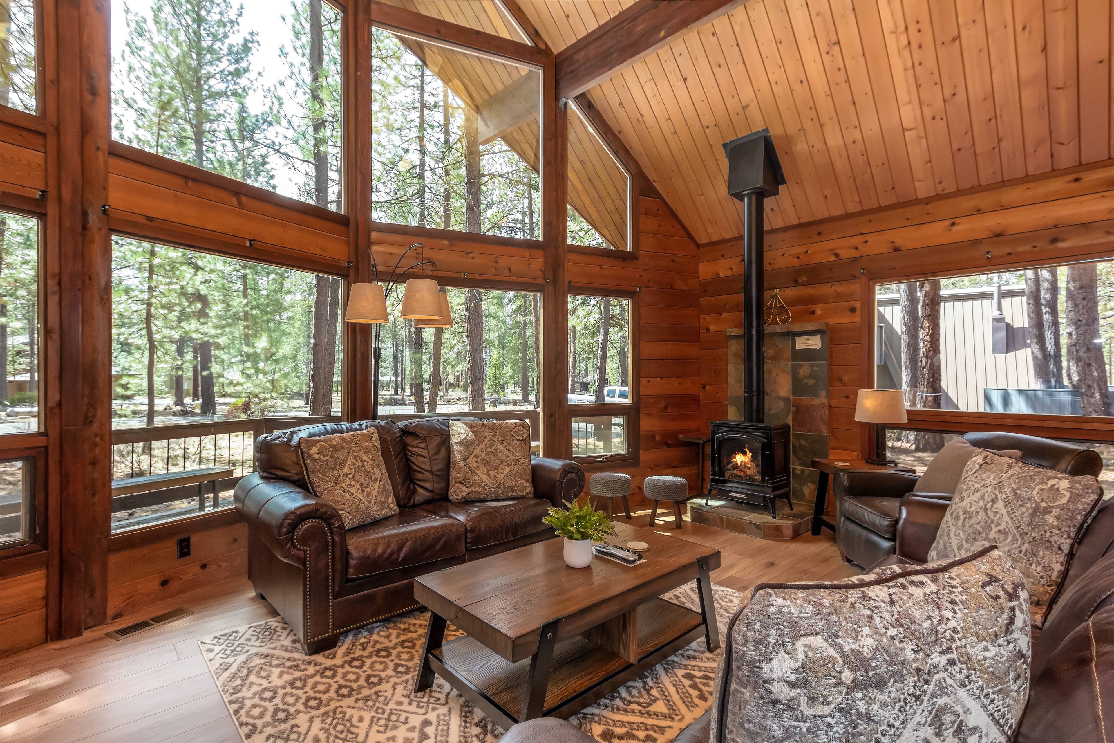 This air-conditioned chalet-style home features tons of classic Sunriver "cabin in the woods" character with floor-to-ceiling windows, exposed beams, and a cozy gas fireplace in the living room. The first floor features a ramped entry, a well-stocked kitchen with butcher block counter-tops and an adjacent dining area.