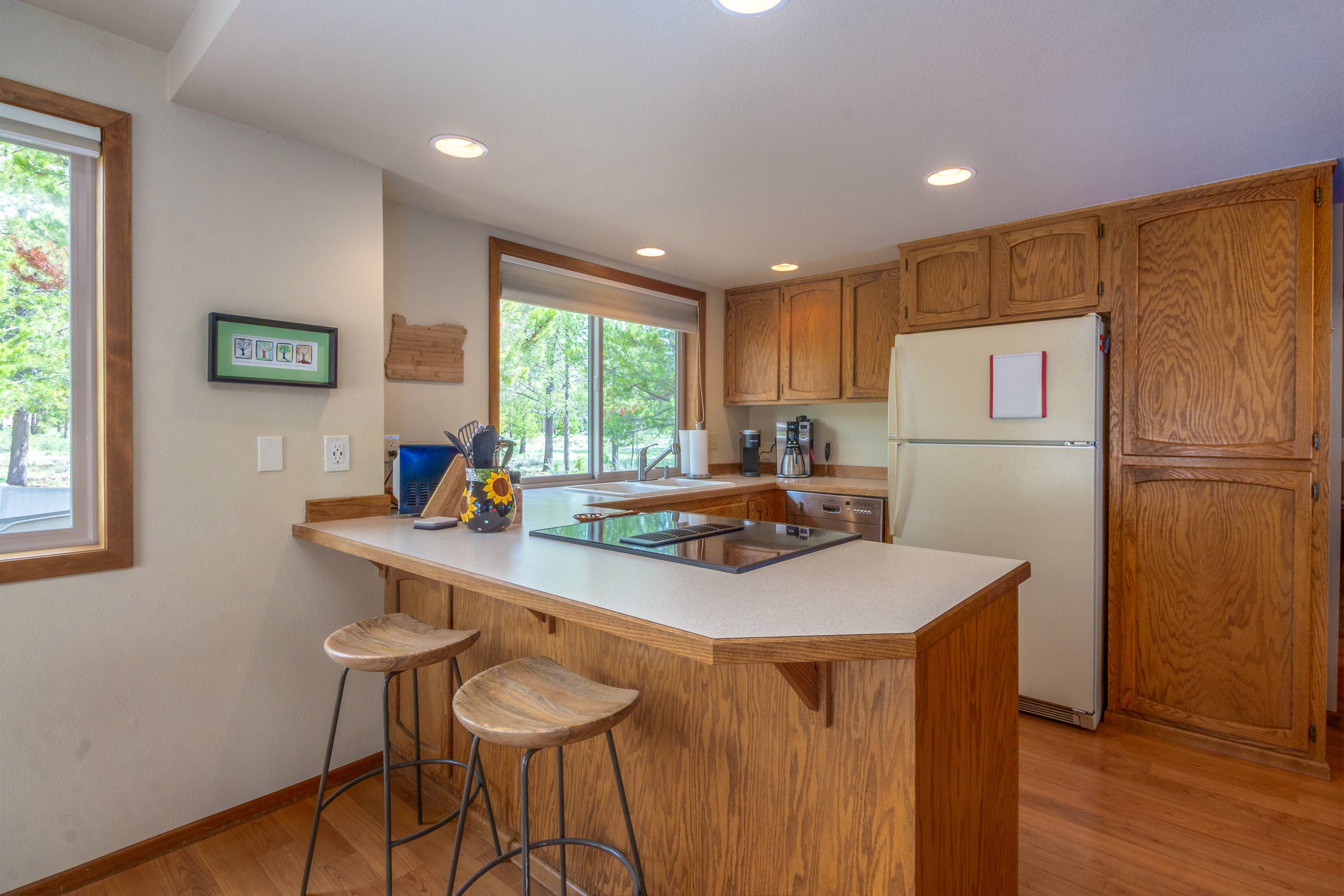 This 2 bedroom home invites you in with cozy furnishings, lofty ceilings of natural wood beams and large windows that frame the deck and the surrounding forest. The living room, warmed by the gas fireplace, has a flatscreen TV and a sofa where you can put your feet up after a day of hiking, biking, fishing, or skiing. Just around the corner in the kitchen, you'll find everything you need to prepare your favorite meal, a peninsula breakfast bar for two, and an adjacent dining space with a table for four.